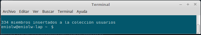 La ejecución de este script debe dejarnos una base de datos MongoDB con una colección que contiene los nombres de usuarios que serán protagonistas de la funcionalidad de lista de rechazo por programar (ver imagen 4). No obstante, sería interesante a modo de ejercicio completar el script con una rutina que valide los nombres de usuarios aquí existente. En este caso es posible lograrlo, ya que se trata de usuarios de Steem, y esta blockchain posee una API pública que nos permitiría comprobarlo. Lo dejaré de tarea para mis lectores programadores :)