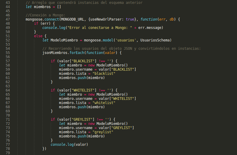 Definimos un arreglo miembros (línea 44) que se llena con instancias de ModeloMiembro, creadas a partir de los datos contenidos en nuestro objeto JSON obtenido en pasos previos (nombre de usuario y tipo de lista a la que pertenece) (ĺíneas 61, 68, 75). Ese arreglo es insertado en la base de datos a través del método insertMany de Mongoose (línea 81).