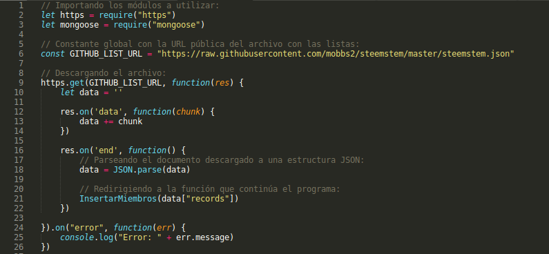 La fuente es un archivo JSON de las "listas blanca, negra y gris" de @SteemSTEM. Recientemente tuve el honor de colaborar con este proyecto en términos de programación, y estos ejemplares me parecen idóneos. Para los conocedores del módulo HTTP, sabemos que el método get hará la descarga del contenido de manera gradual en el evento data (línea 12 y 13) y luego se parsea manualmente a formato JSON una vez completada la descarga (línea 18).