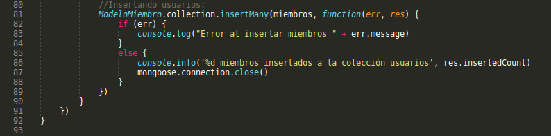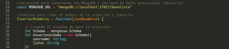A continuación, defino una la función InsertarMiembros que será llamada vía callback por el script anterior (línea 21). En ella primeramente definiré un modelo para representar los documentos a almacenar en la colección: