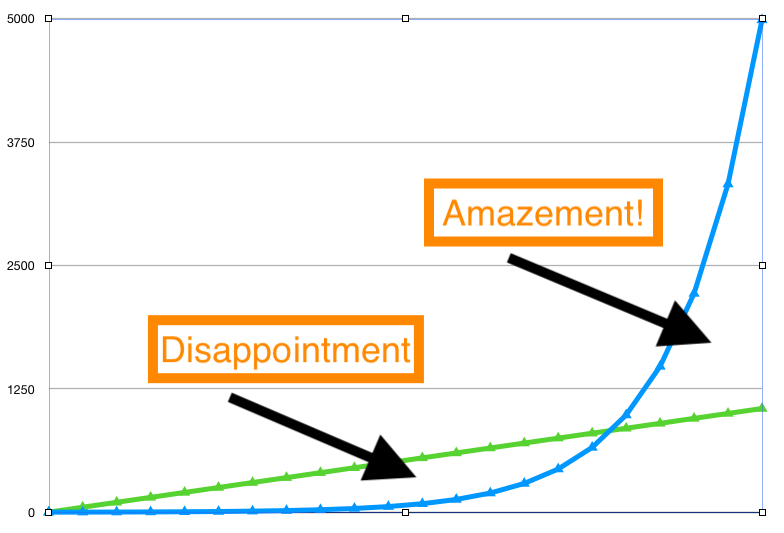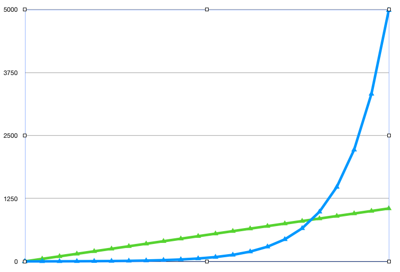 The blue line in the diagram below is an example of exponential growth, while the green line is simple linear growth. As we can see, the exponential line stays well below the linear line for the majority of the time covered by the graph, before streaking up far past it at the end.