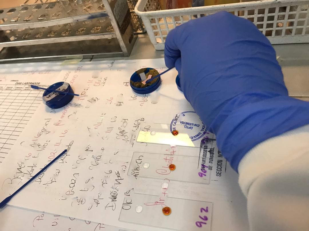 En ambos casos se coloca una gota de solución salina y otra de Lugol en una misma lamina, se abre el recolector de heces y con un aplicador de madera o plástico, se toma una pequeña porción y se mezcla con ambos líquidos, se coloca una laminilla sobre las preparaciones y está listo para observar al microscopio, se deben observar quistes o trofozoitos.