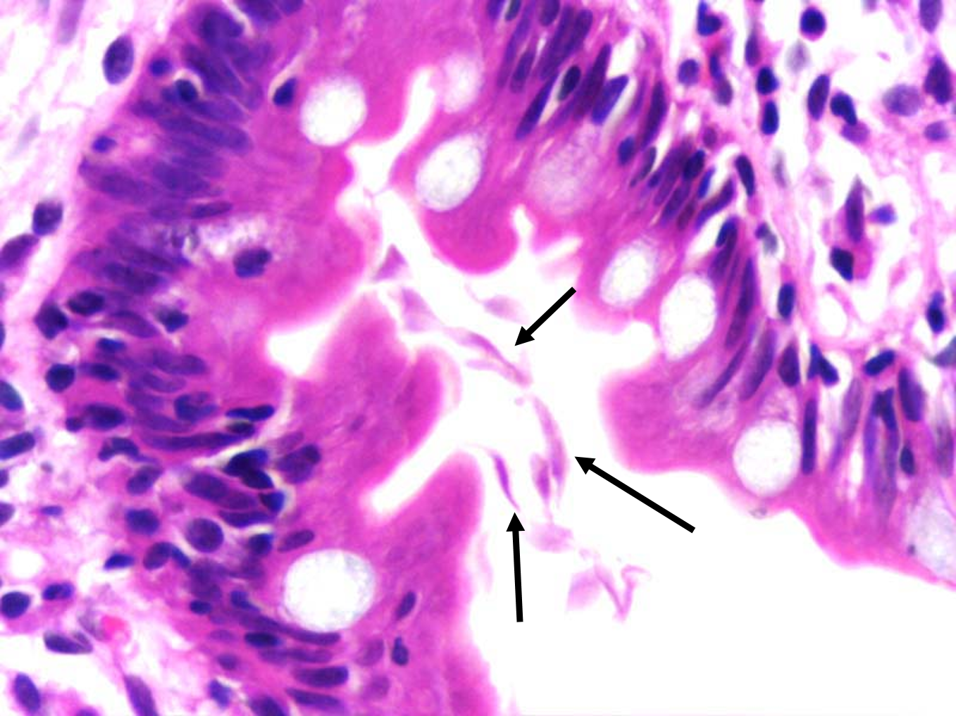 Biopsia de la mucosa del intestino delgado (duodeno) con giardiasis. Tinción H/E