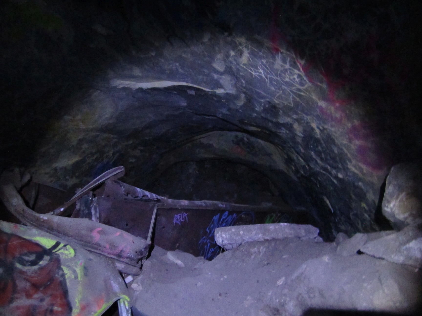 A 30-foot high cave passage almost completely filled with concrete, dirt, metal, and other debris.