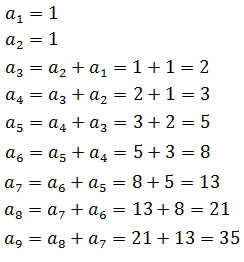 Applying the recurrence relation, the first nine terms of the Fibonacci sequence are:
