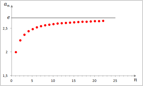 The limit of the sequence of example 2 exists and is the famous number e (irrational number that plays an important role in Mathematics similar to that played by the number pi, and is the basis of the well-knowns Neperian logarithms) , that is to say: