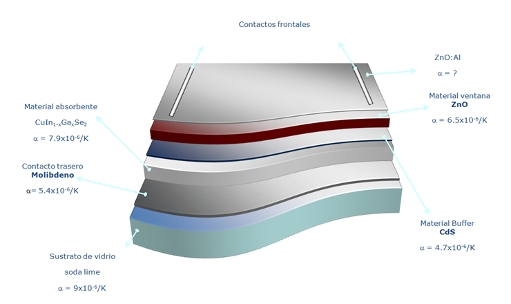 Uno de los requerimientos básicos en este tipo de configuración es el espesor que debe tener cada capa de película delgada que permita la activación de los mecanismos de conducción eléctrica sin mayor dispersión de portadores de carga. Por los momentos, les presento un diagrama de la configuración del prototipo que deseamos desarrollar, tomando en consideración las publicaciones relacionadas con películas delgadas de CuInSe2 y CuIn1-xGaxSe2 y la eficiencia de conversión que alcanza el 20%.
