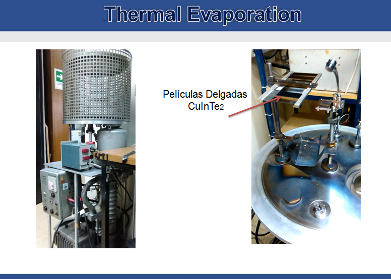 Es una técnica de recubrimiento de superficies con materiales con punto de ebullición menores a 1500 ºC y que requiere una cámara de vacío, resistencia eléctrica de alto punto de fusión, una fuente de corriente-voltaje y un soporte para los sustratos a recubrir. En este trabajo utilizamos un evaporador térmico convencional para depositar una capa delgada (600 nm) del semiconductor CuInTe2 y CuGaTe2 sobre vidrio, ITO y FTO.