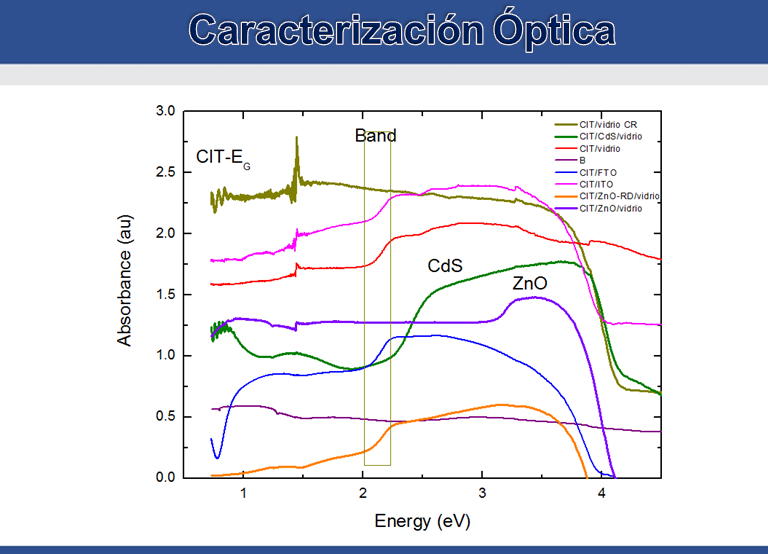 Cada una de las películas delgadas depositadas individualmente las someto a una caracterización óptica y eléctrica para verificar los valores de la brecha de energía y la conductividad eléctrica. Sin embargo, la medida de la absorción óptica en un amplio rango de longitudes de onda sobre todas las capas delgadas depositadas una sobre la otra, me permitirá determinar el porcentaje de transmisión óptica que permita el paso de la radiación luminosa hasta el material absorbente y que se puedan activar los mecanismos de conducción de los portadores de cargas mayoritarios de cada semiconductor.