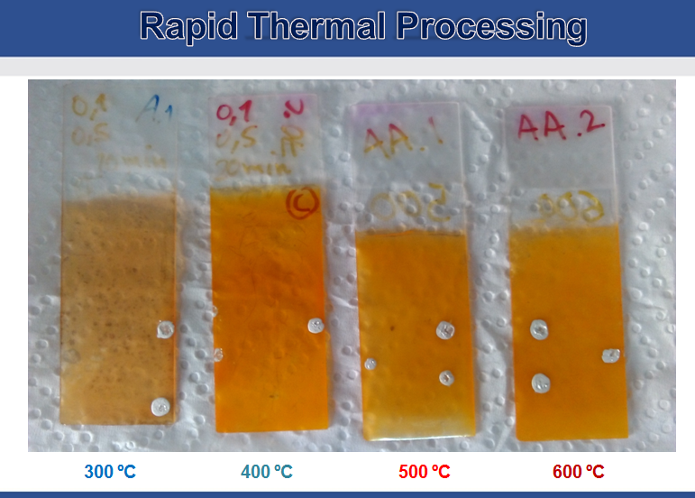 Al principio de las investigaciones sobre las Celdas Solares, me parecía que sería muy sencillo obtener una unión p-n de semiconductores cuyas técnicas de deposición se basan en seguir una receta y realmente me he encontrado varios entramados tecnológicos que hay que superar de manera "técnica". Por ejemplo, el tema de "recocido" debe hacerse en una cámara de vacío y a una temperatura "baja" que no destruya las propiedades efectivas del material semiconductor. Aquí, inevitablemente, el tiempo se prolonga más de lo deseado (menos de 1 minuto) por lo que la aplicación del RTP es imposible bajo estas condiciones. Continuaré buscando información sobre el tema de activación de la celda solar y ya estoy solicitando la colaboración de otros investigadores con mayor experiencia en la fabricación de dispositivos, ya que aun no he tenido éxito en fabricar un prototipo que funcione adecuadamente, lo siento!