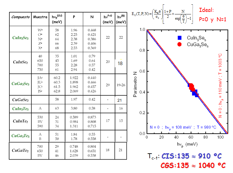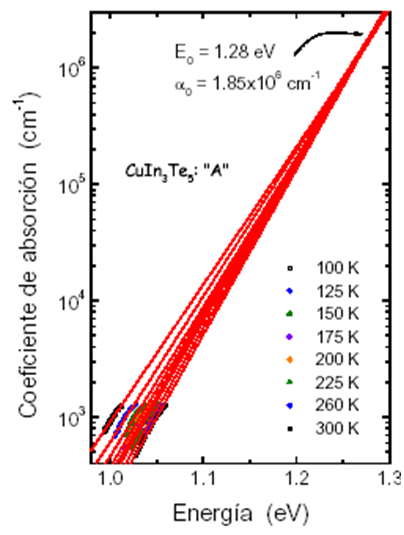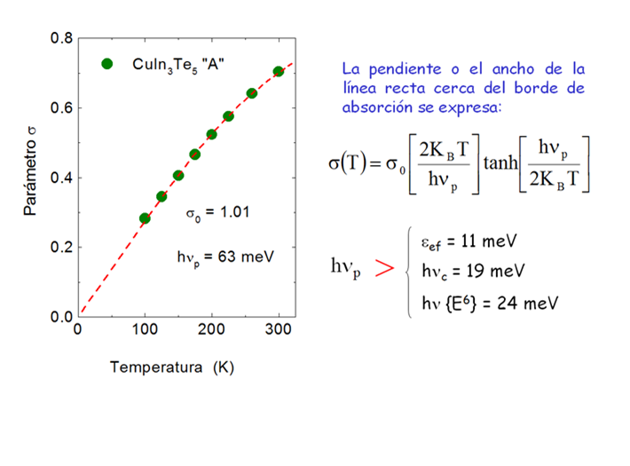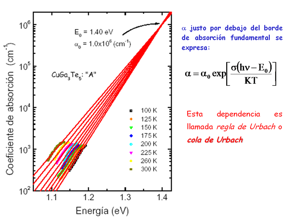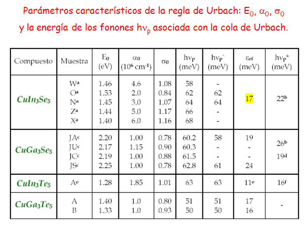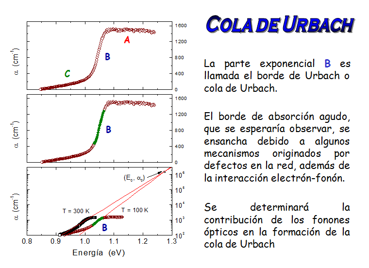 En los casos presentados en la figura anterior, la temperatura equivalente con hvp obtenida del ajuste de la Cola de Urbach, se corresponde muy bien con la temperatura de transición orden-desorden de estos semiconductores.