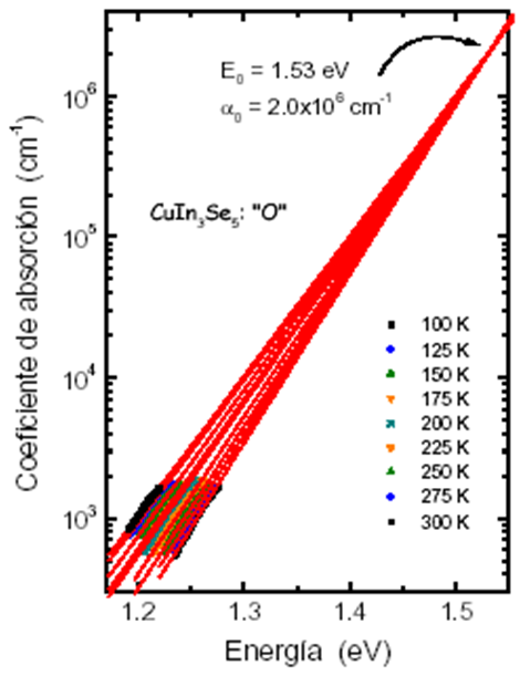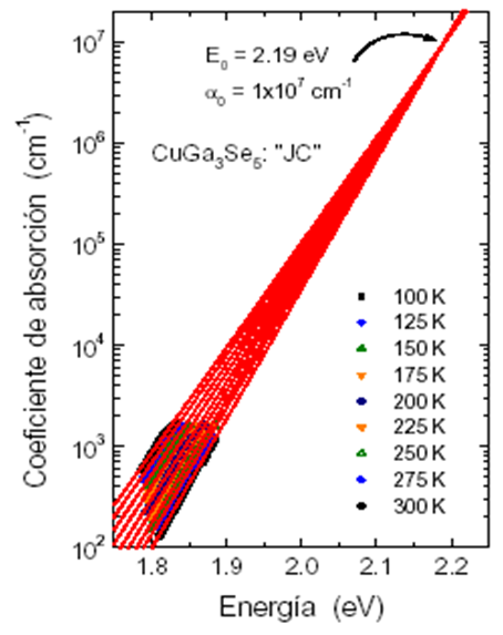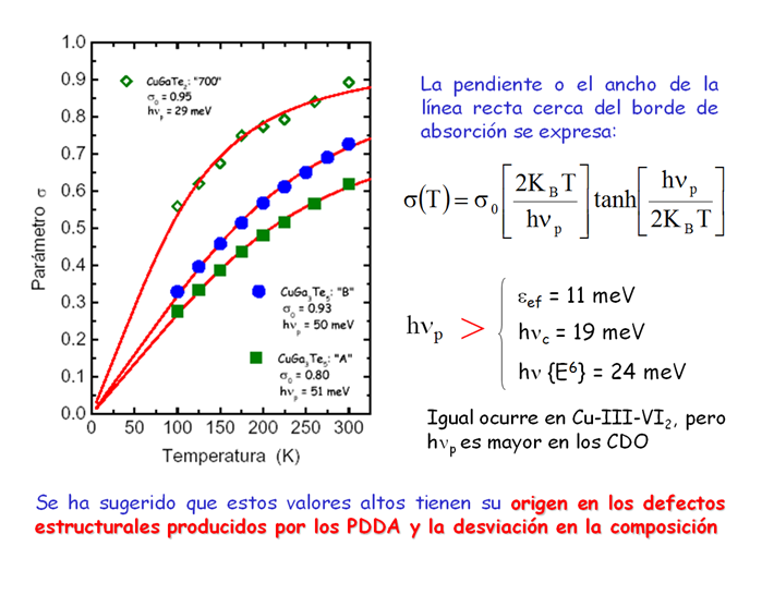 Los parámetros del punto de convergencia E0 y α0 son del mismo orden que en los semiconductores sin defectos, pero la inclinación de cada extrapolación sí es diferente y depende de la interacción electrón-fonón (e-f) y de la energía de los fonones (hvp) que contribuyen en la formación de esa cola energética.