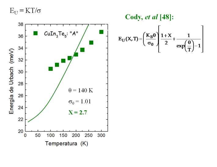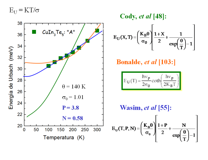 Cuando Cody propuso su ecuación para ajustar la variación de EU vs T la planteó para el Silicio amorfo y pasaba por todos los puntos experimentales, pero al trabajar con semiconductores binarios o ternarios su ajuste no era tan perfecto, tal como se observa en la figura anterior. Así que comenzamos a utilizar la ecuación empírica propuesta por Bonalde y nosotros también desarrollamos un modelo (modificación de la ecuación de Cody) que se ajustara a los datos experimentales.