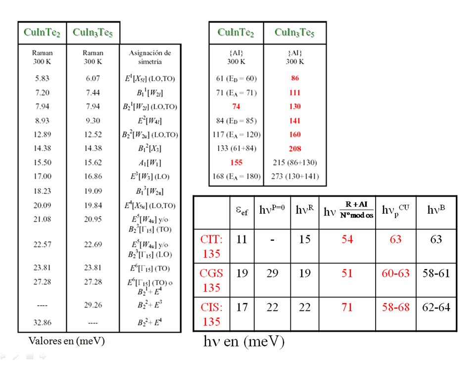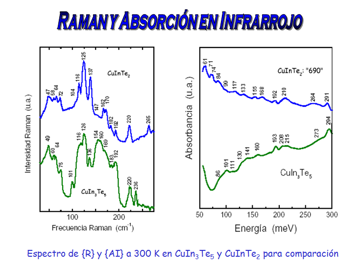 (html comment removed: [if !supportLineBreakNewLine])Una evidencia para demostrar la contribución de los PDDA sobre las propiedades ópticas es a través del estudio de la Espectroscopía Raman y Absorción en el Infrarrojo comparando los modos de vibración de la red observados en los compuestos sin defectos y los que presentan 1 o 2 vacancias de cationes. En la siguiente figura se presentan los casos del CuInTe2 y CuIn3Te5: