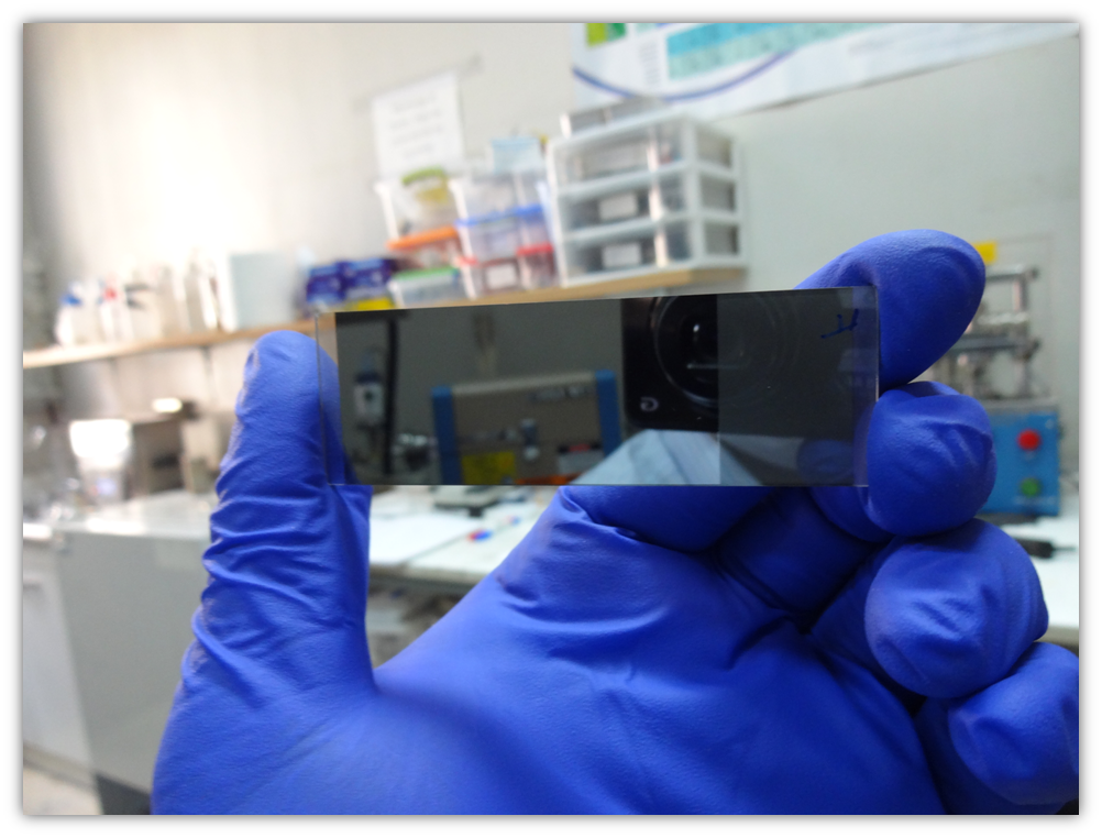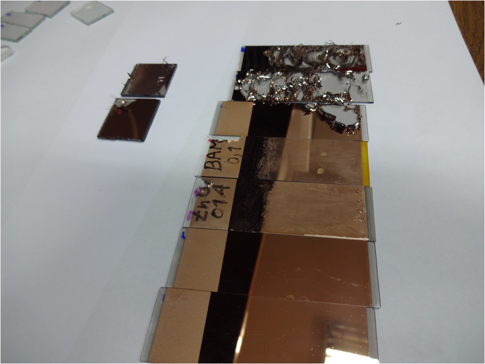 Después de este primer ensayo me queda la satisfacción de observar un recubrimiento extenso y homogéneo de las paredes de la cámara de vacío y sobre todo de los sustratos que había colocado dentro. Por supuesto que aprovechamos los 2 gramos de material e insertamos 2 sustratos de vidrio, 2 con ITO (Indium Tin Oxide), 2 con FTO (Fluorine doped Tin Oxide), 1 con CdS y 1 con ZnO para formar la unión p-n.