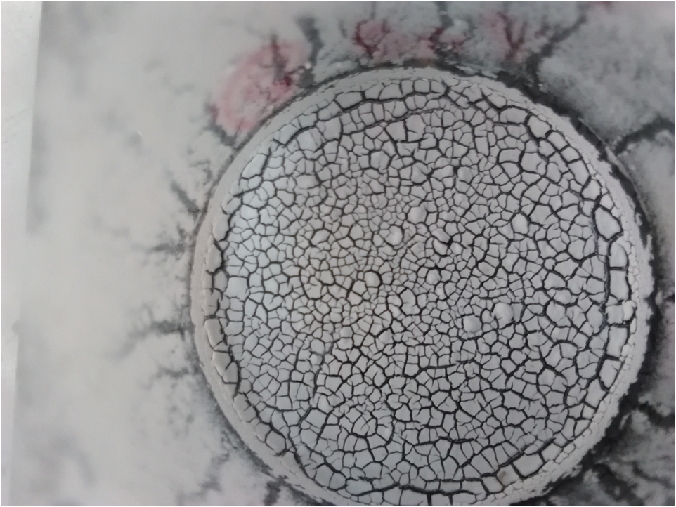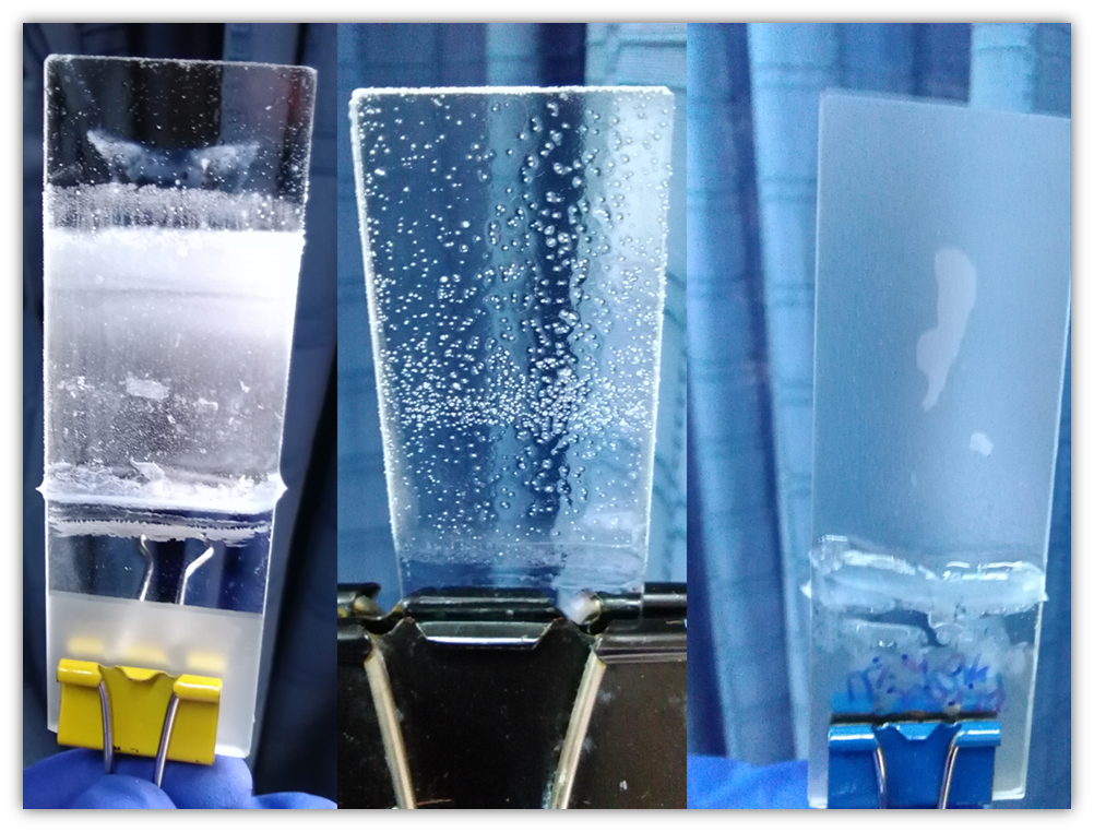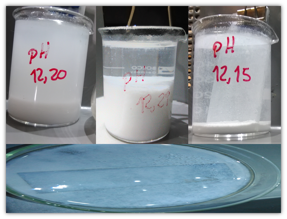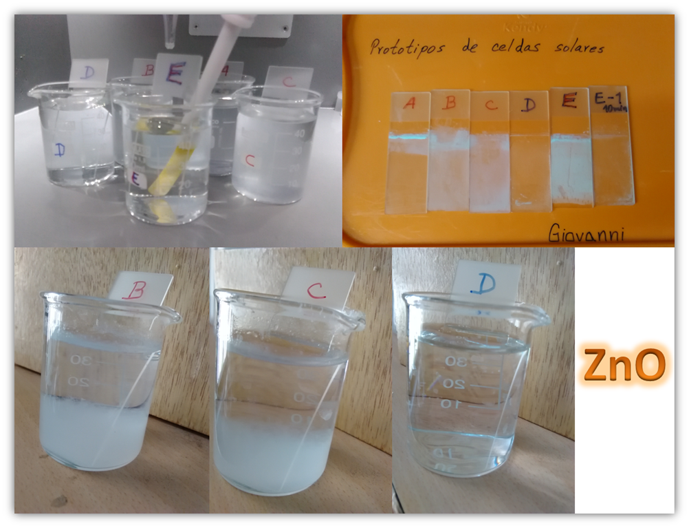 En este ensayo, preparé varias muestras del material semiconductor binario (ZnO) que es de color blanco, con el particulado que decanta al fondo del vaso de precipitados. En esta ocasión coloqué hidróxido de amonio, sulfato de zinc y acetato de zinc en la relación 3:1, para que la reacción se llevara a cabo a temperatura ambiente y se deja sumergida una placa de vidrio para ver la adherencia del ZnO sobre este tipo de sustrato. En las reacciones B, C y E se observa una película delgada de ZnO, pero la adherencia no fue la mejor en comparación con lo obtenido mediante el Método SILAR. En los otros ensayos no se completó la reacción debido al bajo valor de pH (menor de 10).