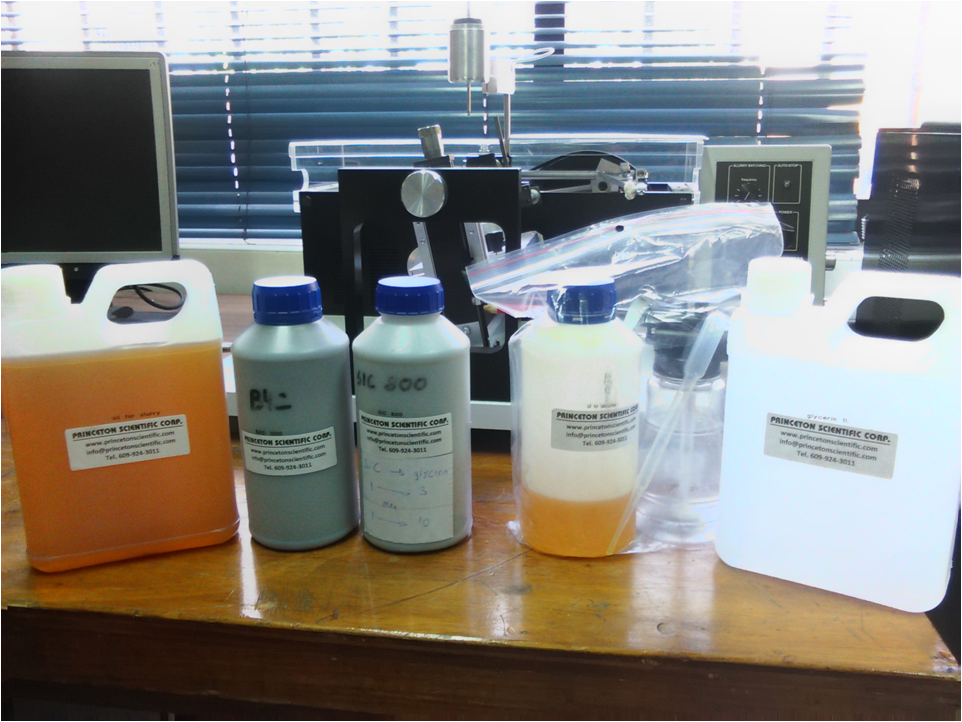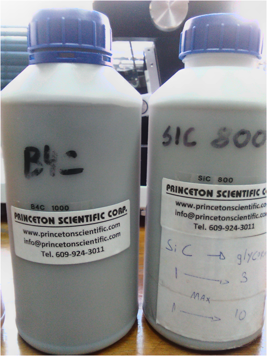 La Glicerina y el Aceite de Corte actúan como lubricantes y refrigerantes, pero también como medio líquido para producir la mezcla con el material abrasivo que viene en forma de polvo. Normalmente el Carburo de Silicio (SiC) en grado 800 o 600 es el más empleado en mis materiales semiconductores, ya que obtengo una velocidad de corte más rápida (10 mm/h) aunque el acabado tiende a dejar la marca del hilo. También dispongo de Carburo de Boro (B4C) de grado 1000 que es más lento el corte, pero la rugosidad y surcos de marcas en las muestras es casi nula.