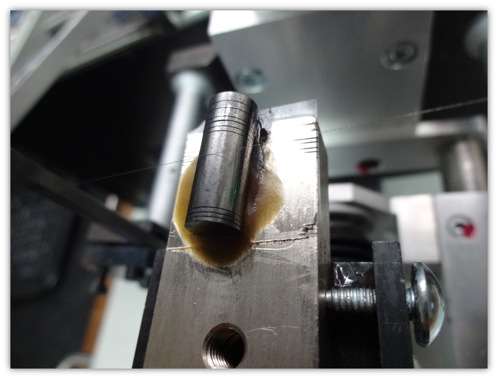 En la siguiente fotografía podemos observar el seccionado que realicé en un lingote de un semiconductor Cu-Ga-Te. Aquí se puede detallar la diferencia en el espaciamiento de cada corte y el diámetro del hilo de tungsteno que se ubica al centro del lingote.