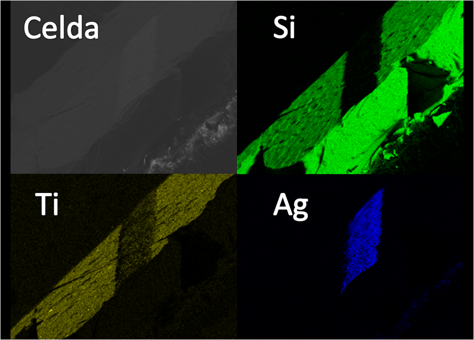 Aquí podemos observar unas microfotografías de una celda de Si y en su configuración está el contacto frontal de Plata (Ag), incorporación de Titanio (Ti) para facilitar la conducción de los portadores de carga y Silicio (Si).
