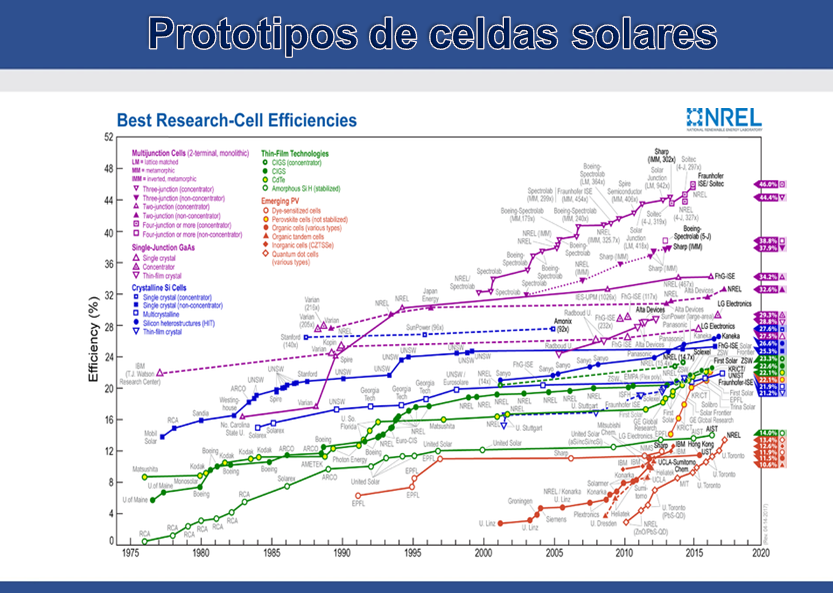 El desarrollo de las tecnologías de fabricación de prototipos de celdas solares va desde el mejoramiento de obtención de material bulk monocristalino hasta la búsqueda de nuevas metodologías de fabricación de películas delgadas de semiconductores, lo que facilita la configuración de múltiples capas. En la siguiente gráfica podemos observar la evolución de la eficiencia de conversión de energía desde 1976 hasta 2017.