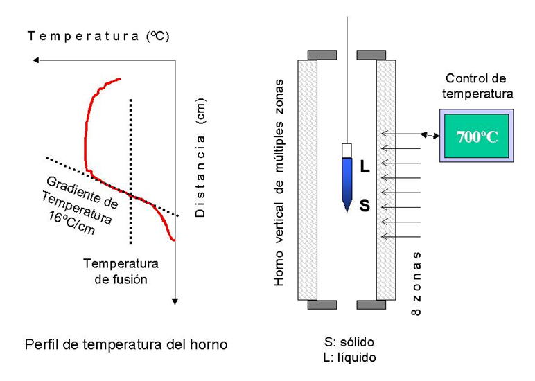 de crecimiento de materiales y policristales usando diferentes métodos de síntesis como la Fusión Directa. Éste último método se aplicará para la obtención de semiconductores en el horno propuesto, el cual nos dará como resultado un