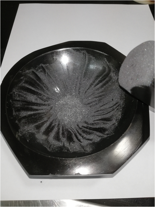 Adicionalmente lijamos el lingote de ZnSe y obtuvimos un polvo de este semiconductor, por lo que lo colocamos en un recipiente y lo lavamos varias veces con agua destilada y dejamos secar en aire.