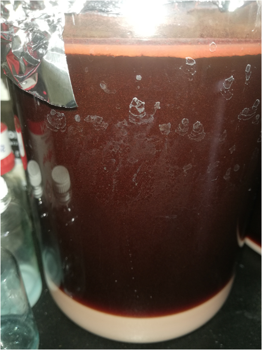 El líquido tenía un color rojizo debido a la reacción del Selenio, en la superficie y en el fondo se observa un producto que va decantando con el tiempo.
