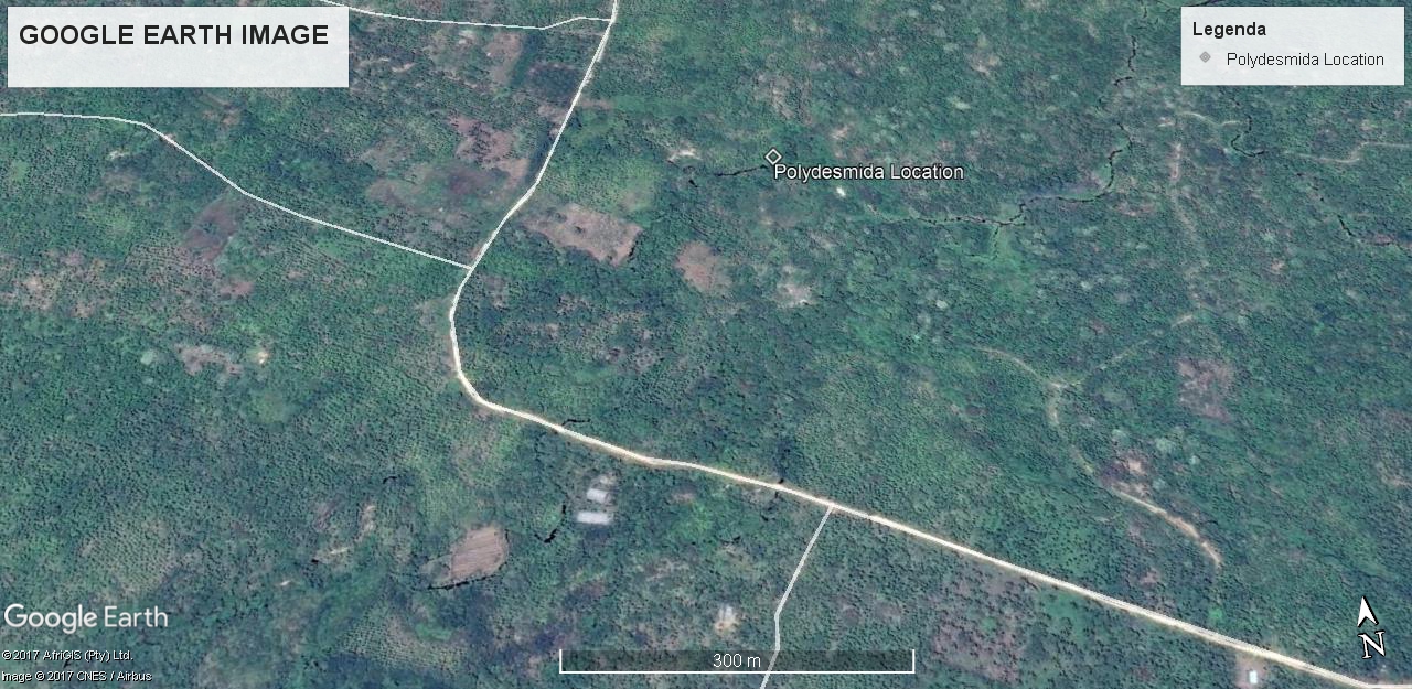 I found this Polydesmida at coordinates 274489.00 m E, 562929.00 m N ZONE 47 N Datum WGS 1984. Location of the discovery is a waterfall in the area nisam district of North aceh. This waterfall called Waterfall Ceuraceuk two levels. the location of the watershed allows a large number of small living insects due to the need for abundant food and water. to get to the location we have to walk as far as 200 meters across the plantation residents.