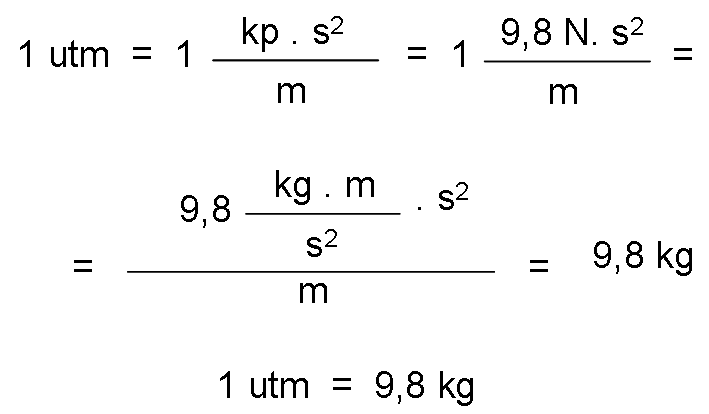 Technical unit of mass is the mass that a body must possess so that, when applying a force of one kilopond, acquire an acceleration of one meter per second squared. It is represented by utm.