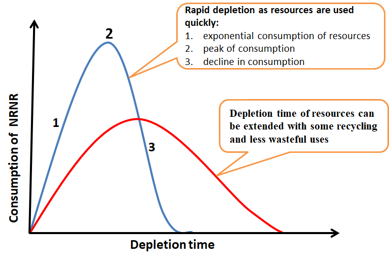 - The peak of consumption always followed by a decline; resources become more difficult to find and process.