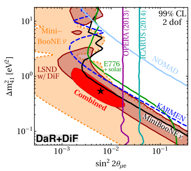Concerning the image, it shows the relations between the mixing pattern of the sterile neutrino with the electron and muon neutrinos (x-axis) and the mass difference between the sterile neutrino and the others (the y-axis). The coloured areas are the regions favoured by the anomalies, the red area being the most favoured one. The vertical lines (OPERA and ICARUS) are constraints: everything on their right is excluded. The other lines represent constraints from the non observation of anything by other experiments: everything on top is excluded. I hope this clarifies the whole story. Otherwise, feel free to come back to me!