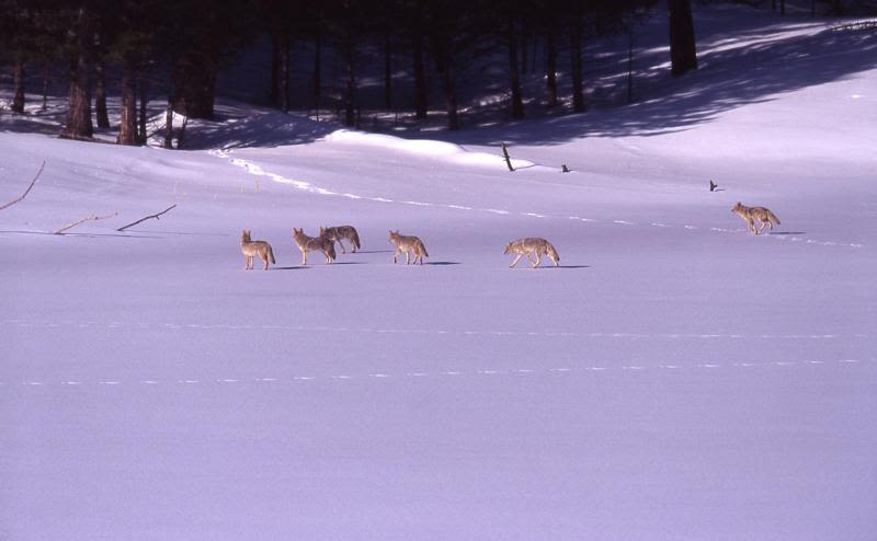 A pack of coyotes in Yellowstone National Park. National Park Service, Public Domain