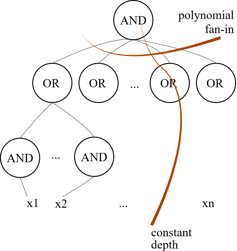 inputs. Instead of specifying a single machine, we’re actually specifying an infinite number of machines, one for each input size. - “Constant-depth”: the depth of a circuit is how many gates there are between any input and the output. So, circuits in this family must have a maximum depth, no matter how large n gets.
