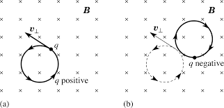 For a magnetic field pointing towards the observer, a positive charge describes a circle in the clockwise direction. For a negatively charged particle Ωc must be replaced by −Ωc in the results of this sub-section. Hence, (4.30) shows that for a
