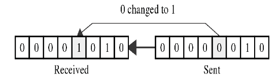 Single Bit: This is the type of error in which a 1 is changed to a 0 or a 0 is changed to a 1, single bit error can occur if we are sending data using parallel TX, for example, if 8 wires are used to send all of the eight bits of a byte at the same time and one of the wires is noise, one bit can be corrupted in each byte.