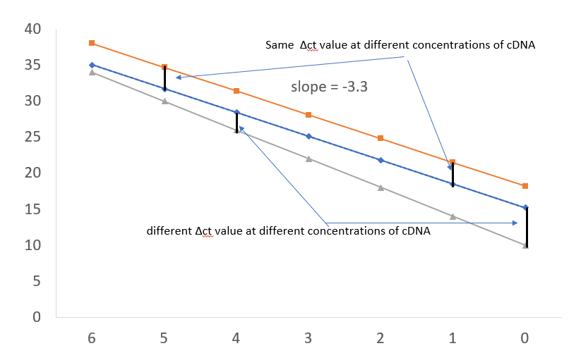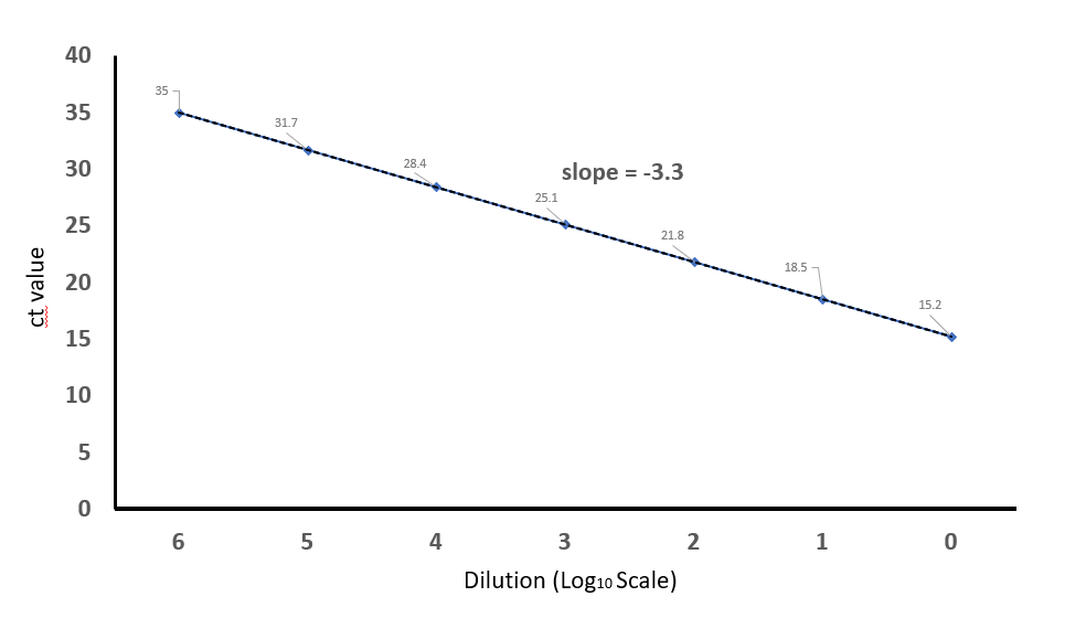 You make a plot starting with highest ct value that you get for maximum dilution to no dilution at all. And then you calculate the slope of the line. If everything is ideal your slope should be close to -3.3