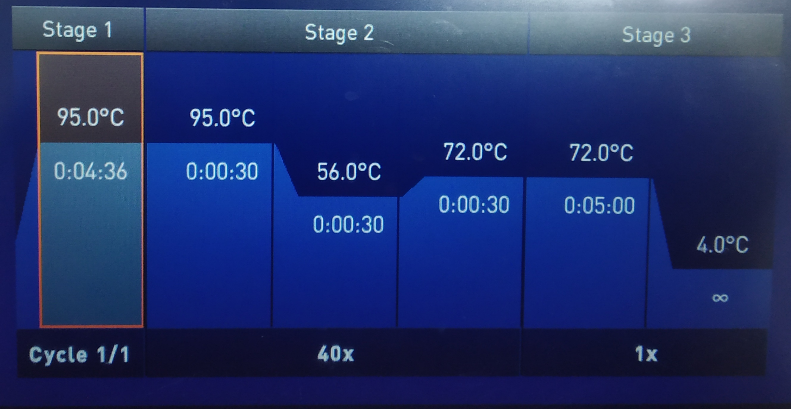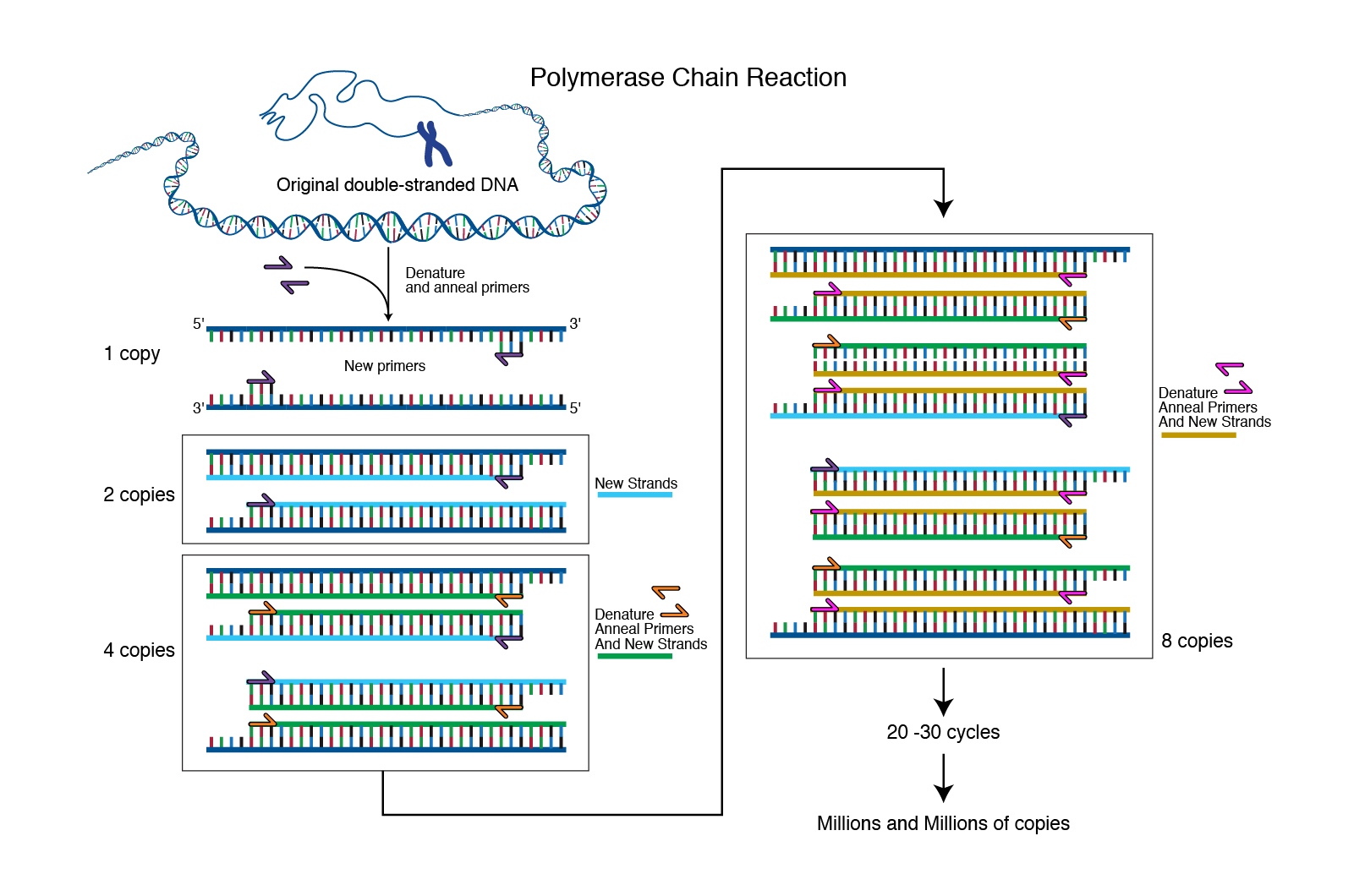 Hence, if you started with one copy of the gene in one reaction, after 1 cycle you will get 2 copies. After 2 cycles you will have 4, and 3 cycles you will have 8 copies of the gene you intend to amplify.