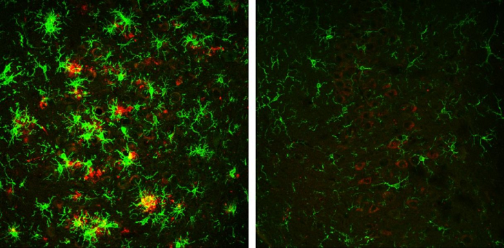 The brain of a 10-month-old mouse with Alzheimer's disease (left) is full of amyloid plaques (red) surrounded by activated microglial cells (green). But these hallmarks of Alzheimer's disease are reversed in animals that have gradually lost the BACE1 enzyme (right).