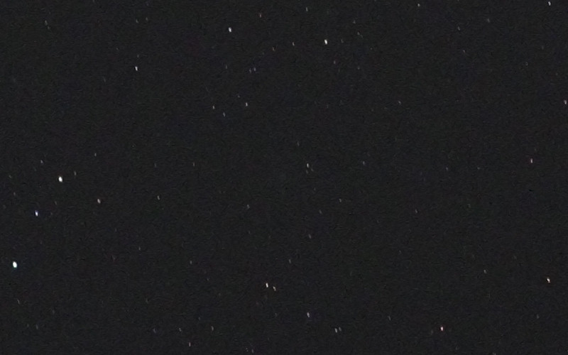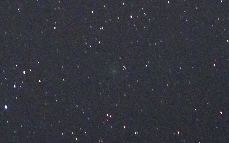 Setting the camera in manual mode, 10 second exposure and ISO1600, and the lens to 25mm f2.8, here is the result (a 800x500 pixel crop around where the comet is). Self timer mode was used to avoid camera shake. I did have the camera in jpeg mode, which is a bit of a cardinal sin in astrophotography, but it does simplify the process.
