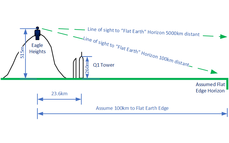 Using this geometry and Similiar triangle it is easy to show that if the earth was flat the horizon would appear much higher than the tops of the buildings. Even if the “Edge” of the flat earth were just 100km from the camera, the horizon would have still appeared higher than the 322m mast of the Q1 tower (which it clearly doesn’t). Having flown over the Ocean in that direction towards New Zealand I can vouch for that edge would have to be over 3000km away, and therefore a flat earth horizon would have to appear at a level close to twice as high as the buildings.