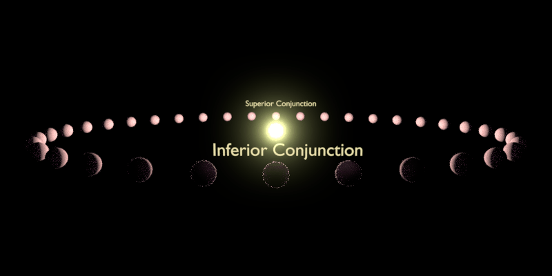 Animation showing the how Venus moves through Superior conjunction (behind the sun) and Inferior Conjunction (in front of the sun). Point's to note are how the phases change, the size changes and the effects of atmospheric scattering of sunlight around inferior conjunction (planet appears as a circle of light)