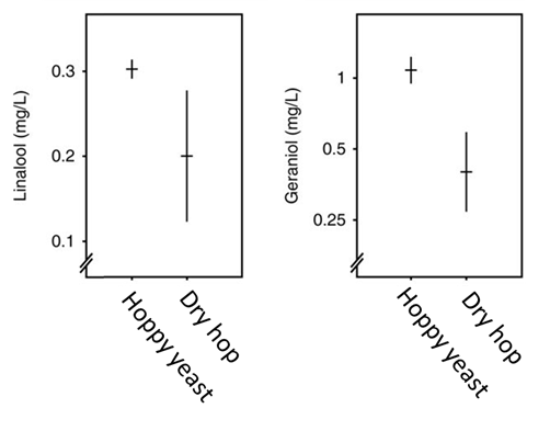 Linalool and geraniol levels in beer brewed wtih hoppy yeast vs traditionally dry hopped beer. Adapted from (7)