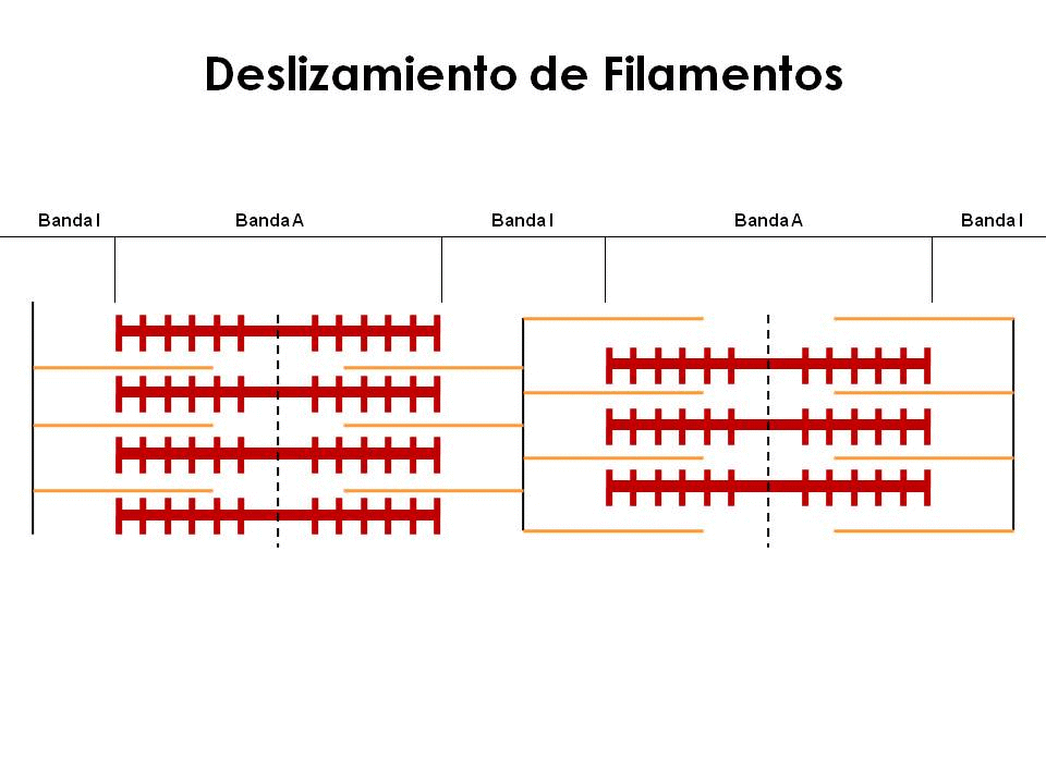 Una vez desencadenado el potencial de acción en el sarcolema, este se desplaza por los túbulos “T” hasta alcanzar el retículo sarcoplásmico, lugar donde se encuentra almacenado el calcio que , a raíz del potencial de acción es liberado el sarcoplásma (citoplasma muscular) difundiendo hasta los filamentos finos para reaccionar con el complejo troponina-tropomiosina y descubrir los puntos de unión con la miosina, iniciando con ello el ciclo contráctil. El acoplamiento y desacoplamiento de los puentes cruzados -aprovechando los golpes de potencia o fuerza- se da por el deslizamiento de los filamentos finos sobre los gruesos hacia la línea media, ocasiona la reducción de las bandas “I” y “H” acortando la sarcómera hasta lograr la contracción muscular.