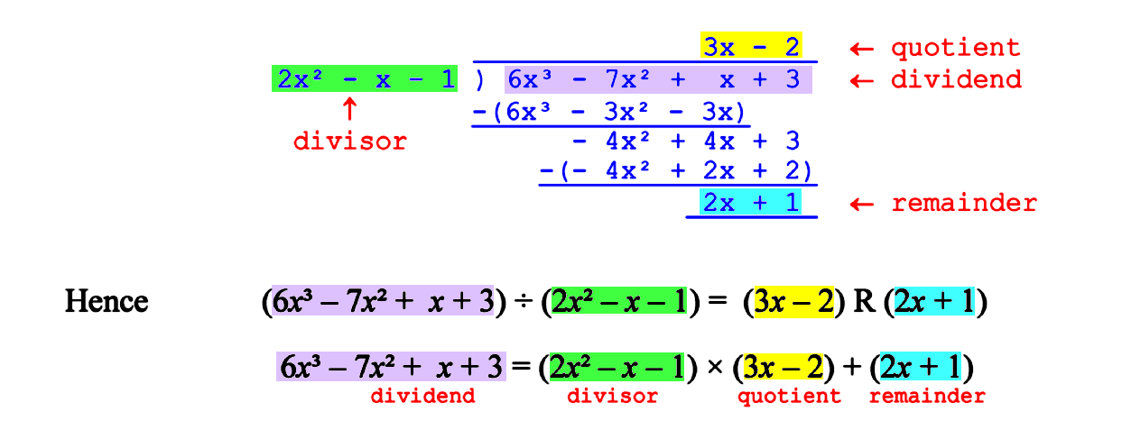 Let us start with what we know from primary / elementary school. We know that for whole numbers, we have, for example 17 ÷ 3 = 5 r 2. The quotient is 5 and the remainder is 2. We can always write the dividend (the original number to be divided) as dividend = divisor × quotient + remainder. In this example, we would write 17 = 3 × 5 + 2. Also notice that the remainder is always less than the divisor.