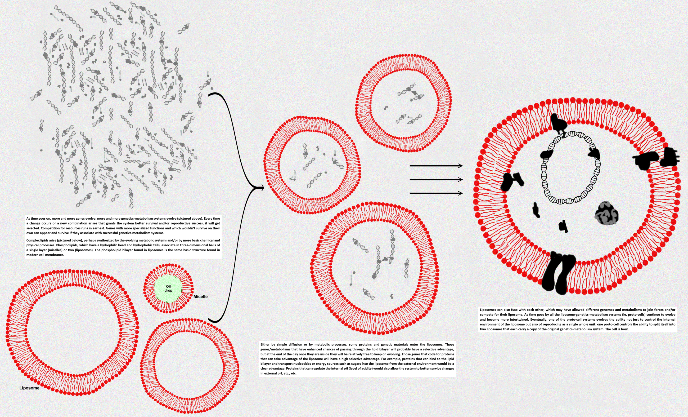 To understand how the first cell came into being we must turn to lipids. Yes, greasy, nasty fats actually have very interesting properties other than making your cheese-burger tasty. Phospholipids in particular readily self-assemble into liposomes or micelles (see picture below) when in aqueous solution and, interestingly enough, the cell membrane shares the same basic structure with liposomes. This happens because these molecules are very polarized: one end is hydrophilic (attracts water, repels lipids), the rest is hydrophobic (repels water, attracts lipids). For an idea of how we can go from liposomes to cells take a look at the gorgeous figure below: