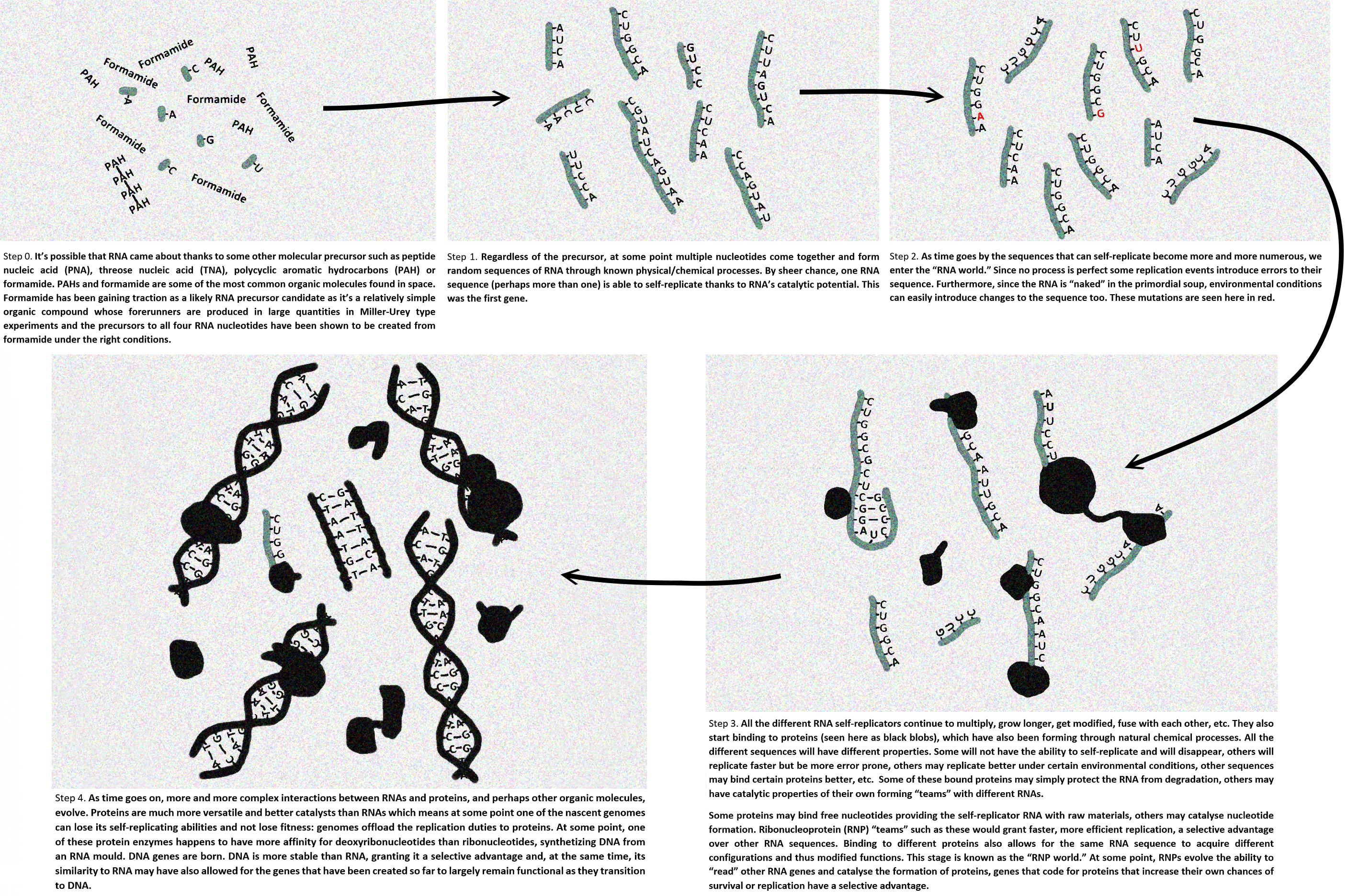 Once the first replicator arises, natural selection [4] can take place and the story of life can begin. I won't bore you with a wall-of-text-explainer when you can instead look at this beautiful figure I made: