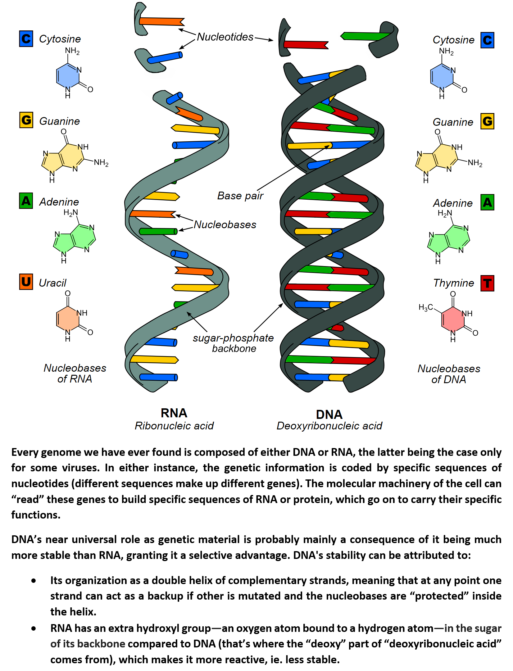 Before moving on you should be aware I have decided not to dwell on molecular genetics to keep things flowing. The origins of life were very molecular so you will still want to check the following image to get a grip on some basic properties of DNA and RNA. If you are feeling extra curious—a feeling you should only fear if you are a cat—you can always read this article which I think does a decent job of explaining all the basics.