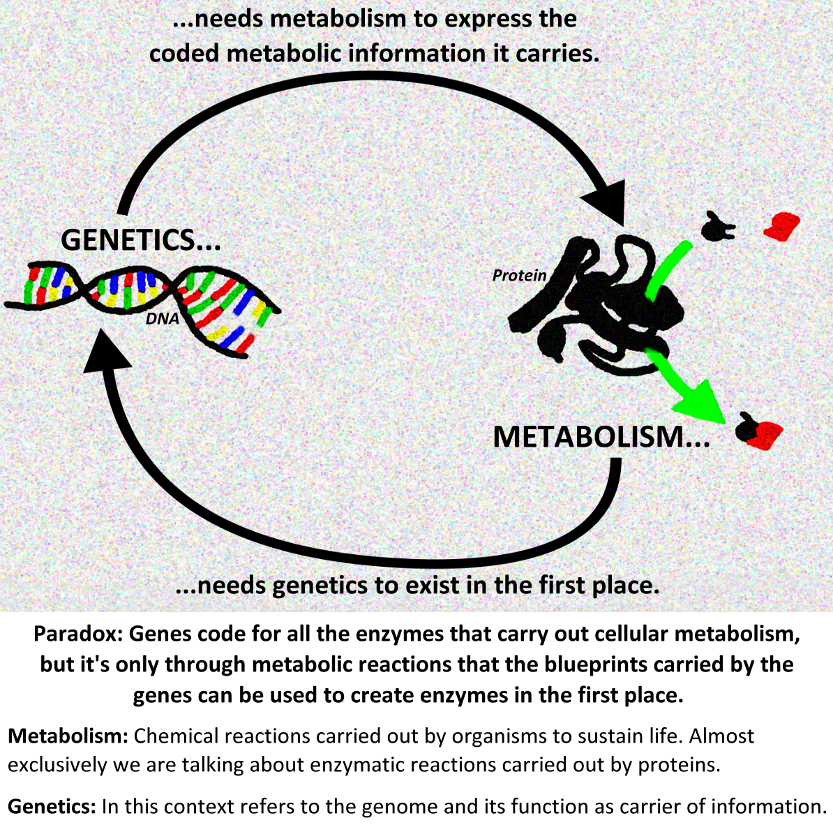 This is important because nowadays genomes cannot exist without metabolism (they need metabolism to replicate, repair, everything really). You can think of the genome as the blueprint to a building, unless it has engineers, workers and etc. (i.e. "metabolism") to read it accurately and bring the raw materials to shape, the blueprint will just be an inert and basically useless piece of paper. Conversely, metabolism needs genomes to exist (genomes code for, among other things, the enzymes and other molecules that create metabolism: it's not a blueprint for the building only, but also for the workers and engineers!). We are left with your typical chicken-or-egg kind of question [2].
