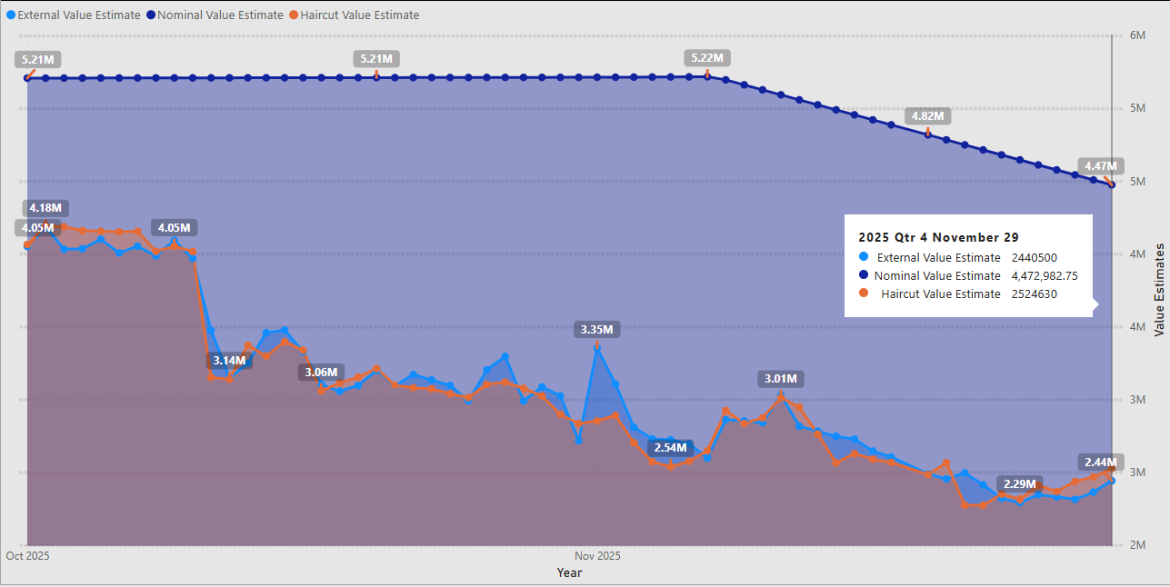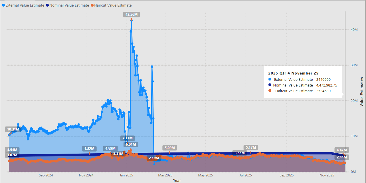 - Repeating from last week, the external value and the haircut value have been continuing to track closely together, ever since the Upbit delisting.