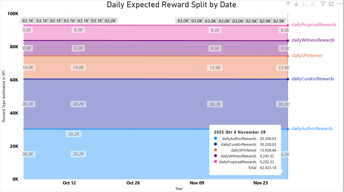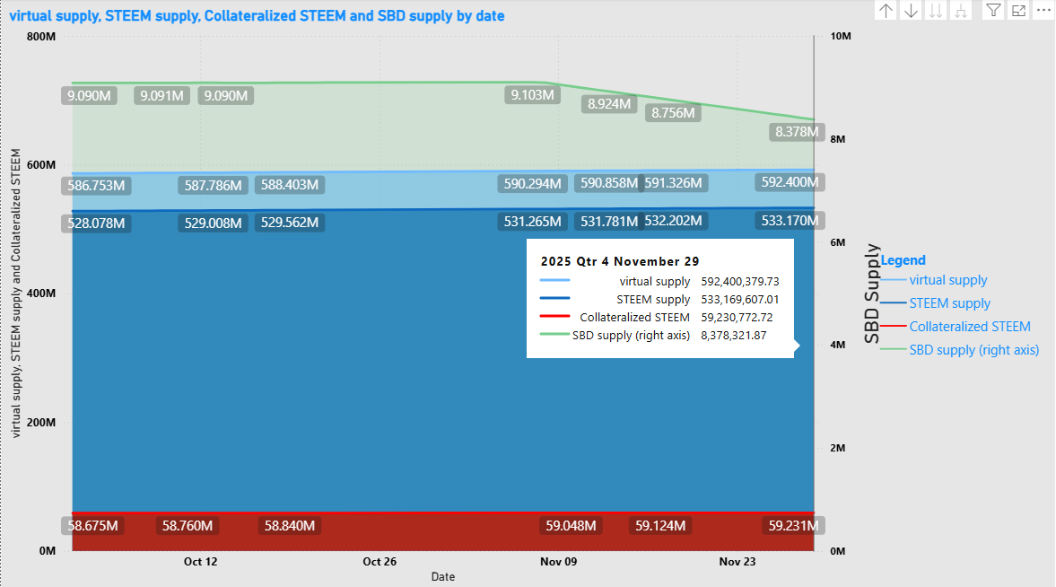 - The virtual supply, current size, and collateralized STEEM are all scaled against the left axis.